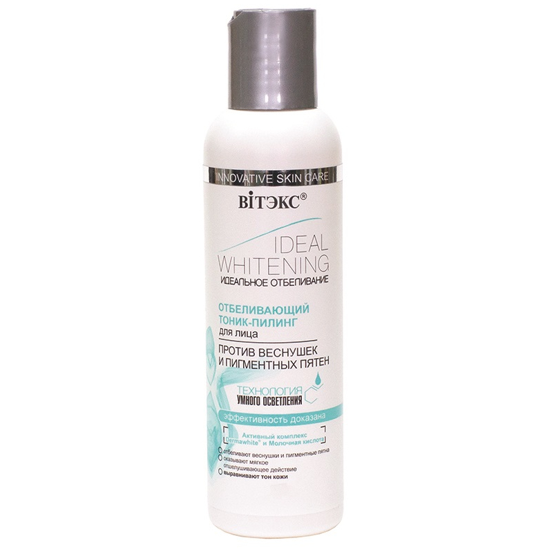 Отбеливающий тоник-пилинг выравнивает цвет кожи и минимизирует появление пигментных пятен.